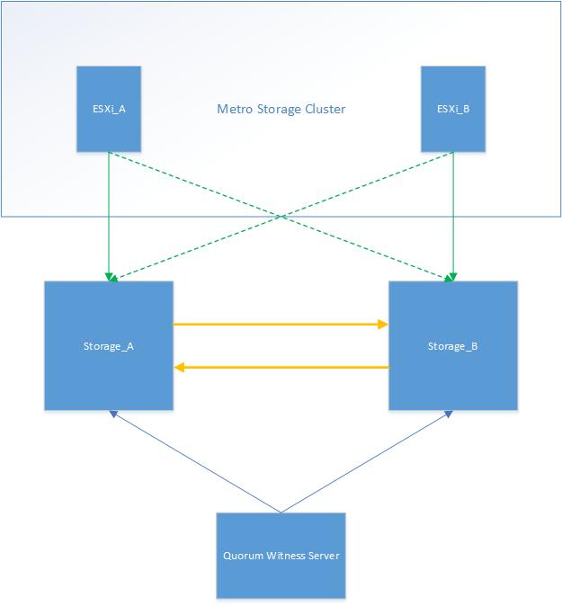 - HA registers killed virtual machines to ESXi_B accessing Storage_B and power-on