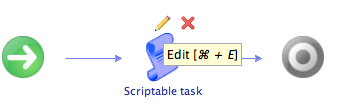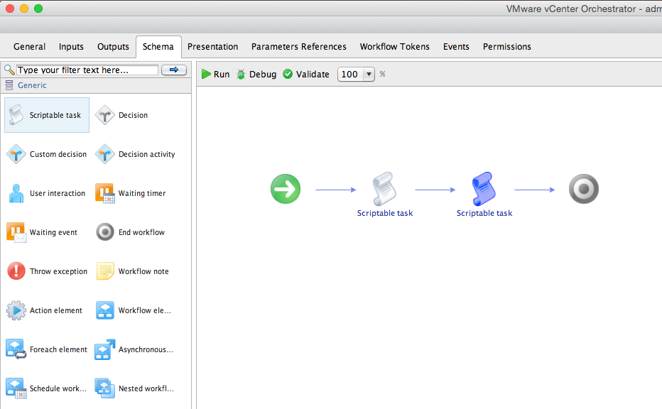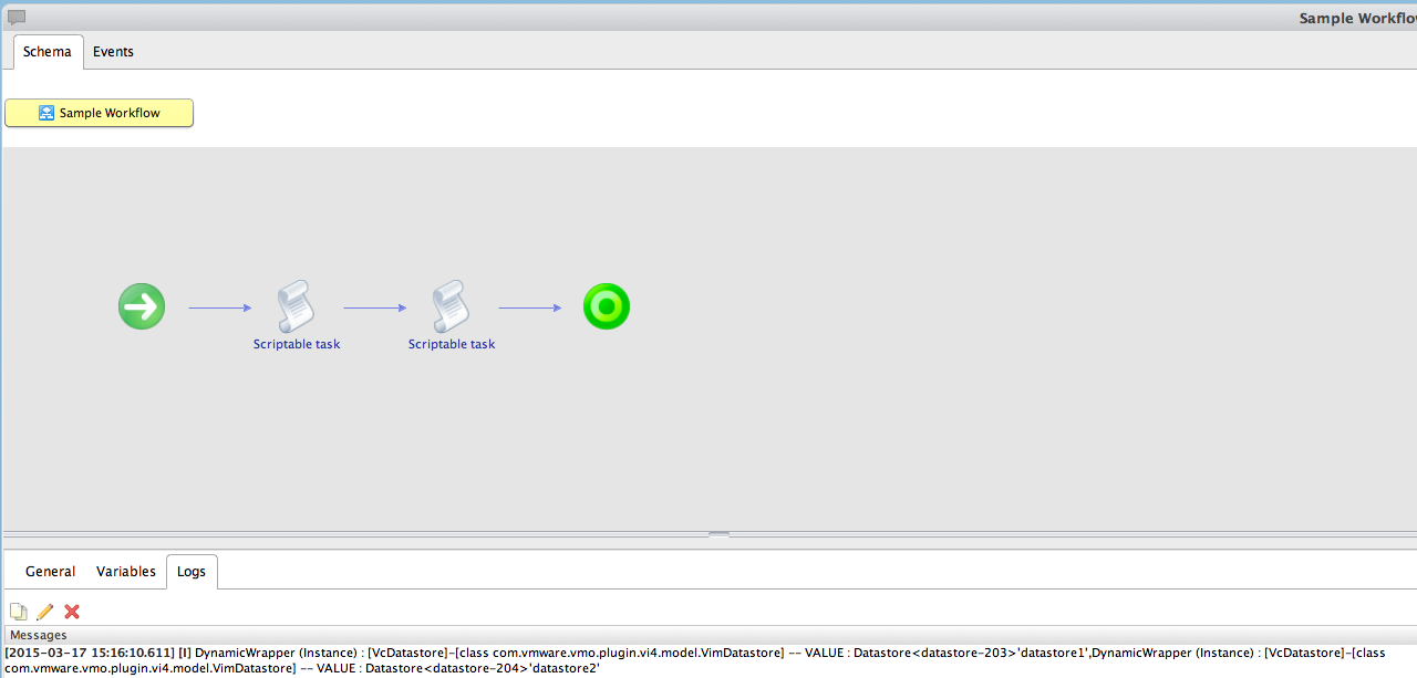In this exercise, we’ve replaced a scriptable task to an action. Instead of using the action itself like above, you could call the action from a scriptable task. Let’s try it. Edit the Sample Workflow, delete the action and put a scriptable task in between instead: