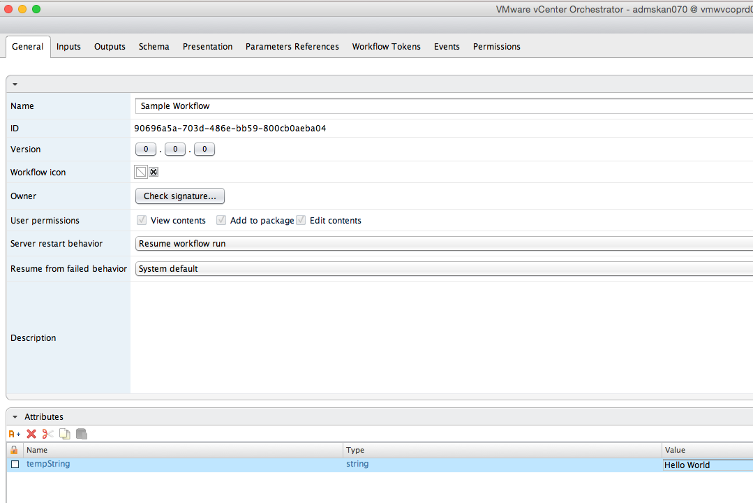 Workflow note is used to visually comment the process within a workflow. Let’s take a look at example below, it’s a workflow I wrote to ensure the VM provisioned from vRA is added to proper DRS group in vMSC cluster making sure the uniform access is achieved. From start to end, I highlighted in yellow saying “Find cluster, convert vCAC:VM to VC:VirtualMachine and find/move to DRS group” and highlight in red for outputting error logs and throw exceptions. This way, it will become much easier to debug processes or transfer this workflow to others: